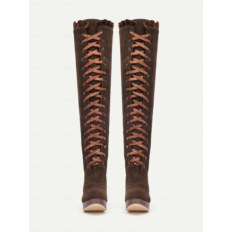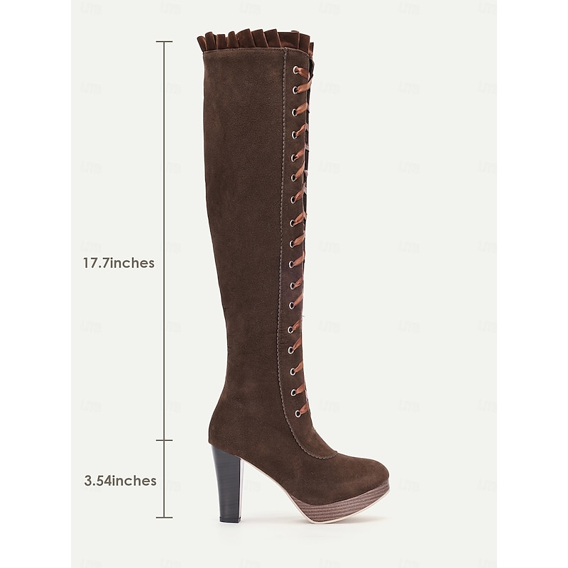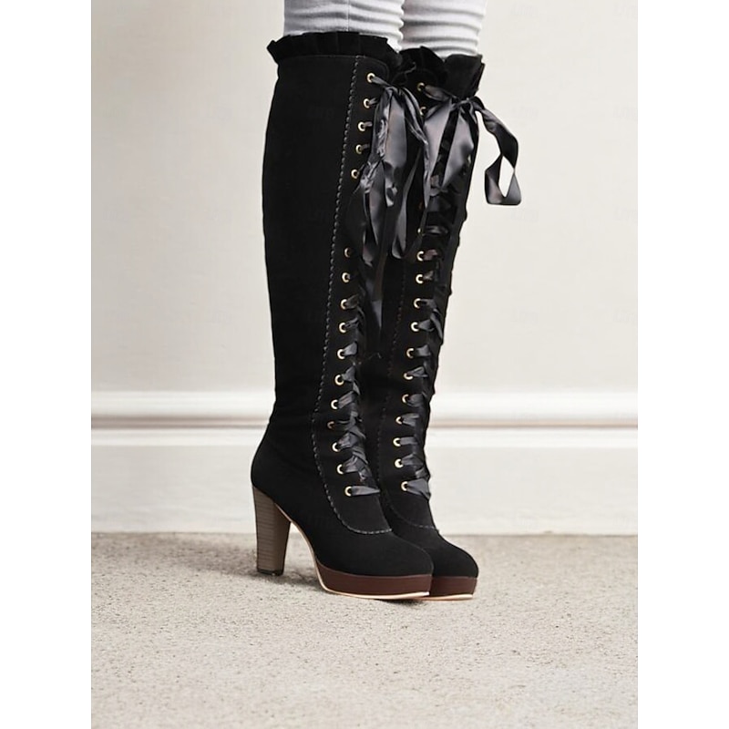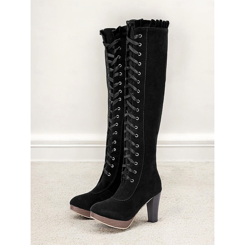 Highlights [Fabric] Crafted from premium faux suede, these Women's Victorian Lace-Up Knee-High Boots offer a plush and luxurious texture that feels soft to the touch. The textile lining provides added warmth and comfort, making them perfect for cooler seasons like spring, fall, and winter. [Silhouette] With a classic over-the-knee design, these boots feature a chunky platform heel that provides both height and stability. The round toe shape offers a comfortable fit, suitable for all-day wear. [Design Highlights] The boots showcase a timeless lace-up front combined with a side zipper for easy wearing. Eyelet detailing and a delicate ruffle trim at the top enhance their vintage elegance, while a ribbon tie adds a chic, feminine touch. [Occasions] Ideal for a variety of settings, these boots complement both party and daily outfits. Whether you're heading to work or attending a vintage-themed event, these trendy boots seamlessly blend into your ensemble, providing a sophisticated and retro flair. [Size Notice] Available in sizes ranging from US 5.5 to US 10.5 (EU 35 to EU 42), these boots are designed to fit true to size. Select your usual size for the best fit. Perfect for everyday use. first-class materials and excellent craftsmanship ensure long-lasting durability.