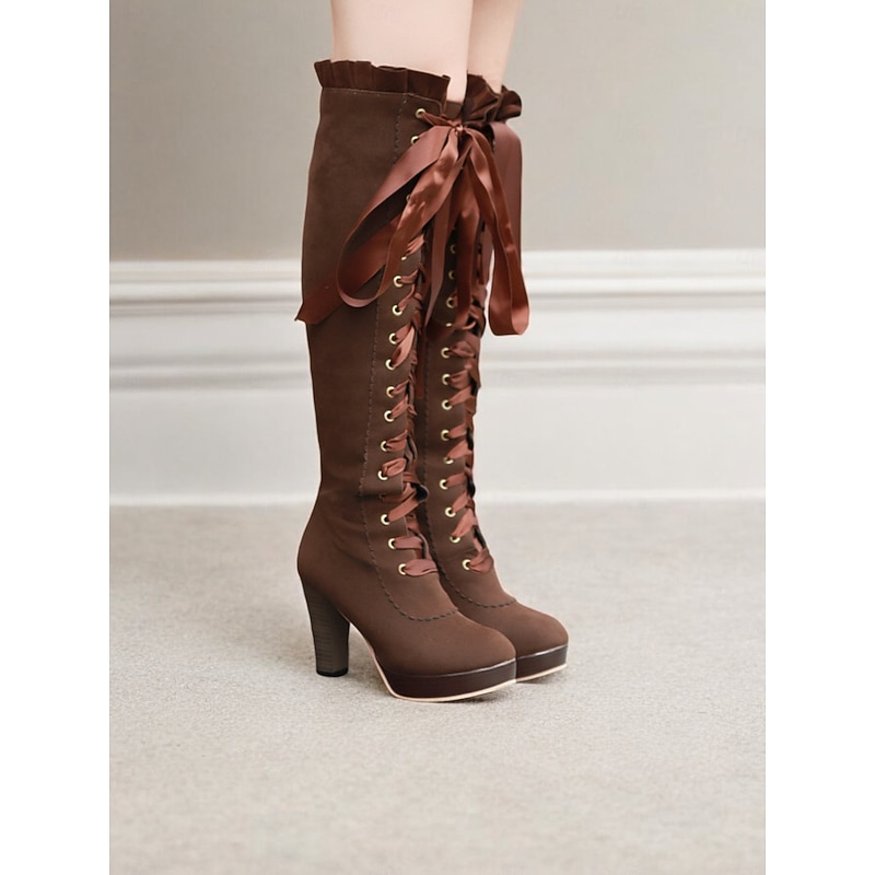 Women's Brown Victorian Lace-Up Knee-High Boots - Retro Style with Platform Heel, flawless for Cosplay and Vintage-Inspired Outfits
