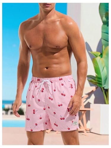 - Features: Swim trunks with compression liner, cherry graphic print, drawstring waist, beach swimming shorts for mens