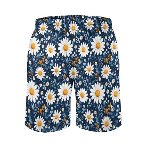 Hawaiian Shorts for Men - White Daisy Floral Print Quick Dry Mens Swim Trunks Bathing Suits with Mesh Lining 1