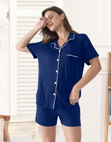 • vintage Design: The button-up women pjs top ensures easy wear with an adjustable opening and trendy contrast notch neck, plus a chest pocket for small items. Pocket-free shorts create a sleek look, and an elastic waistband provides all-day comfort for any body type