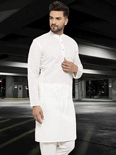 Men's Kurta White Lucknowi Chikankari Kurta Pajama Set Designer Outfit Ethnic Kurta Pajama BY CHAMAN TEXTILE MADE