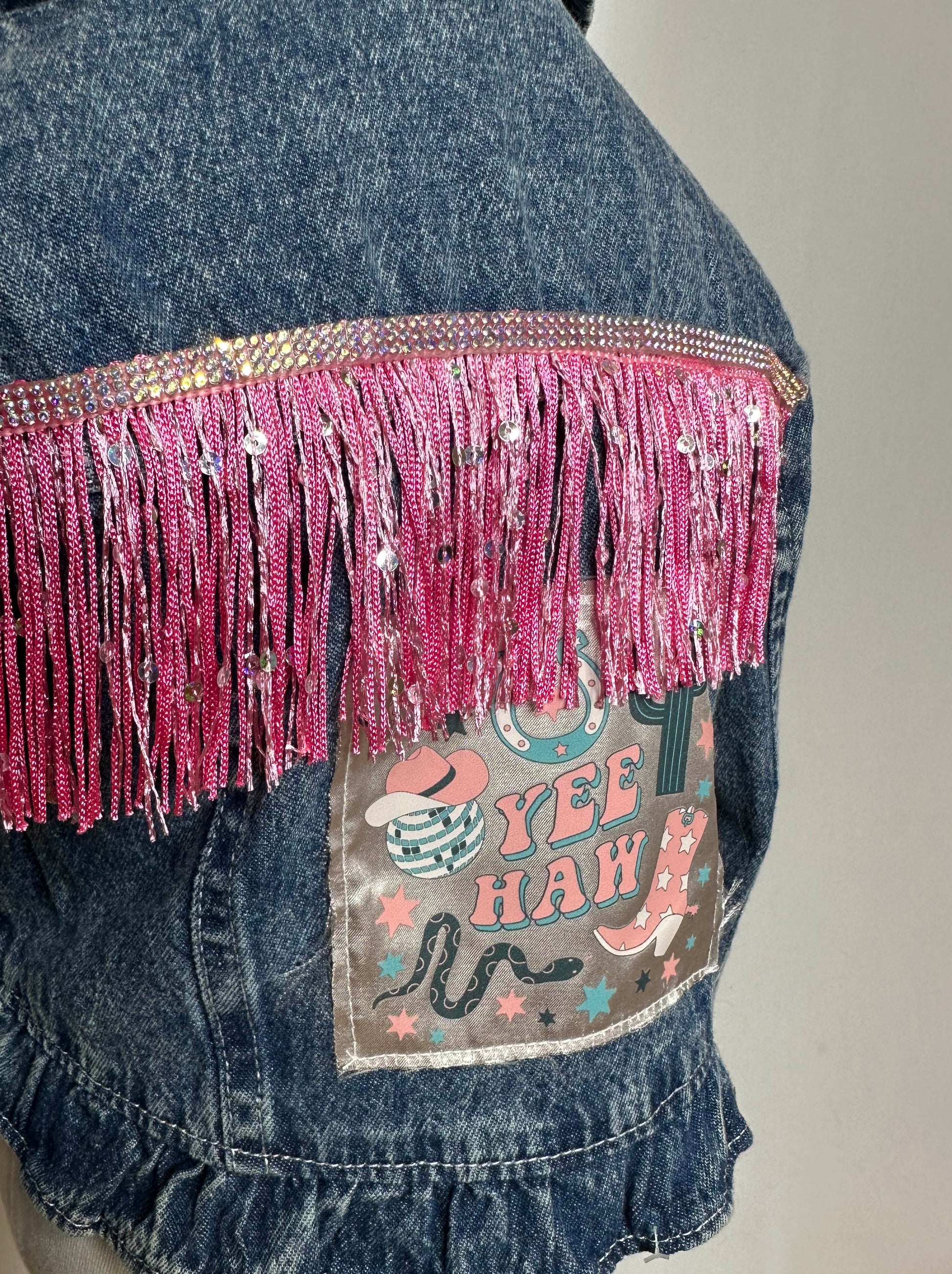 | Product Name | "Yee Haw" Pink Fringe Kids Denim Jacket |